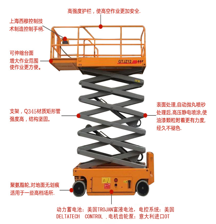 全自行升降平台是靠电瓶动力驱动行走,可以在操作台面进行控制行走、转向及升降的作业平台,是目前最市场上技术含量最高的高空作业设备。